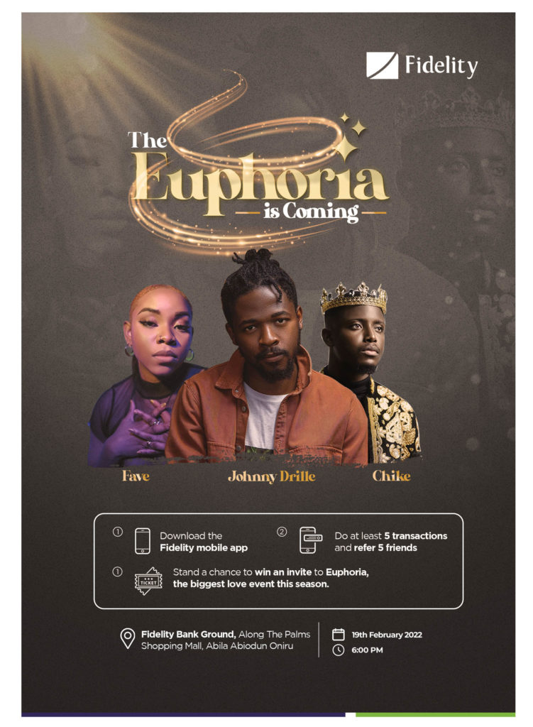 Lagos is set to host its first major concert of the year this weekend as leading financial institution, Fidelity Bank Plc, hosts The Euphoria concert featuring leading music acts, Johnny Drille, Chike and Fave.