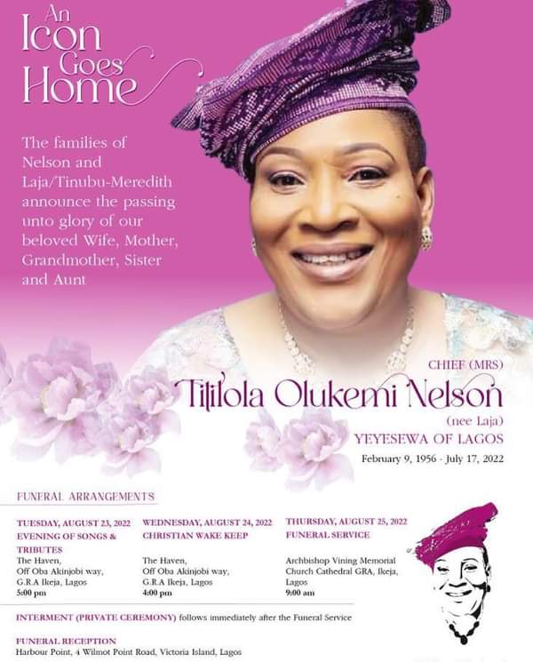 Chief (Mrs) Titilola Olukemi Nelson, the immediate past South-West Zonal Woman Leader of the All Progressives Congress (APC) and Member of the Lagos State Governance Advisory Council (GAC), is to be buried on Thursday August 25, 2022.