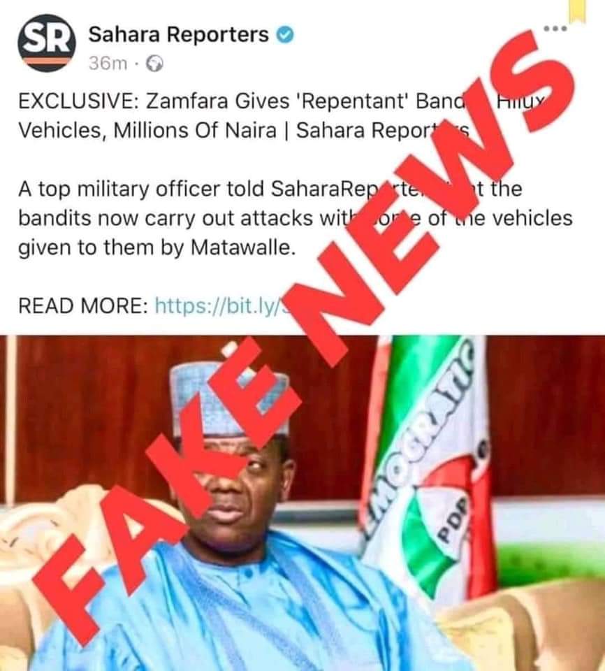 The attention of Zamfara state Government has been drawn to a jaundiced crap called a story by Sahara Reporters where the medium alleged that His Excellency Governor Bello Mohammed (Matawallen Maradun) has given 15 Hilux vans and ‘millions of naira’ to repentant bandits who in turn, are now using the same vehicles to attack innocent communities in the state.