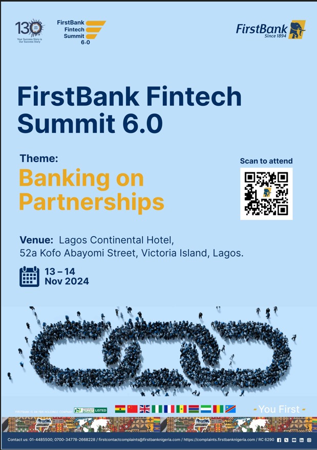 Lagos, Nigeria – FirstBank, the premier West African financial institution and financial inclusion service provider is excited to announce its 6th annual Fintech Summit, themed “Banking on Partnerships,” scheduled to hold on November 13 and 14, 2024. This year's edition will bring together renowned subject matter experts, innovators, and industry leaders from around the world to explore the latest trends and advancements in financial technology.